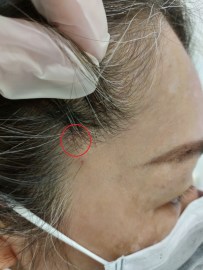 老婆婆臉上有個黑黑的傷口,反覆破皮不會好!