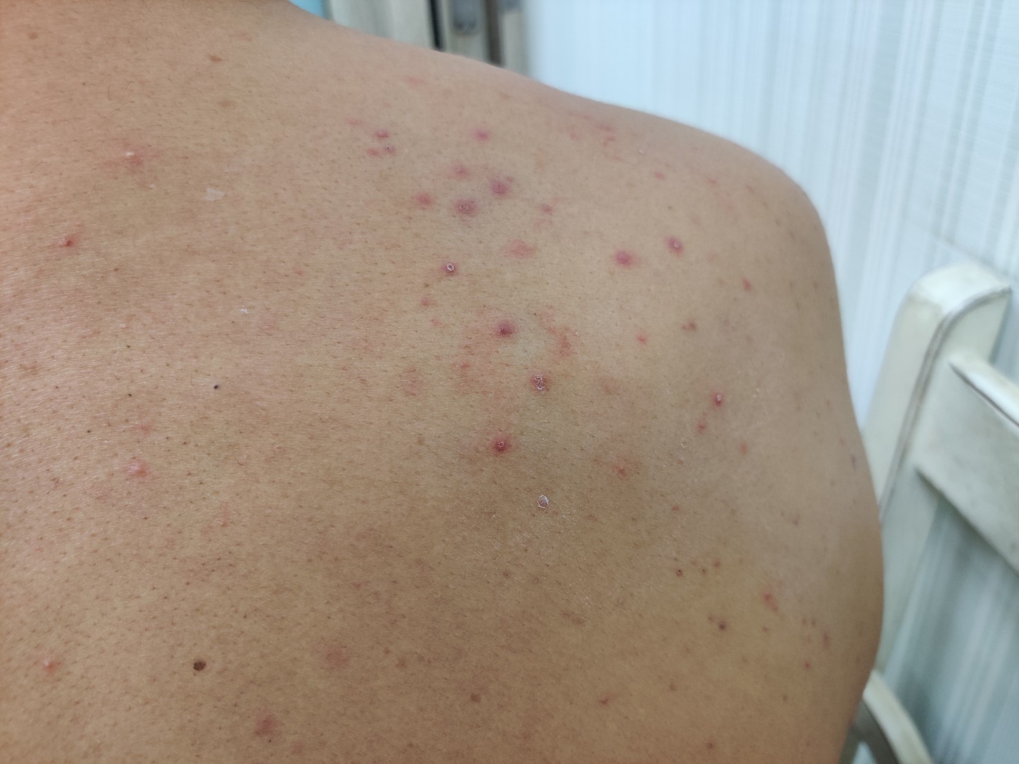 一位四十歲的上班族,一進來立馬就問陳醫師: [奇怪,都四十歲了還會突然長青春痘,真的是很莫名其妙,而且這個青春痘還蠻癢的,長一大堆,不論是自己努力地清潔、自己買成藥使用或是就醫都沒有明顯的效果已經超過兩週了。] 陳醫師端詳了臉上並沒有看到青春痘,甚至覺得臉上皮膚狀況還蠻好,結果原來是在前胸、後背跟肩膀上有很多粒粒分明的痘痘,經過判斷,這個是皮屑芽孢菌的毛囊炎,與一般青春痘其實有很大的不同,也難怪這位先生這麼困擾。