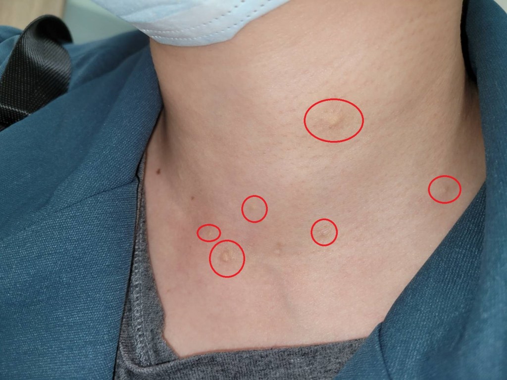 無皮膚表面開口,此囊腫由上皮細胞包圍,皮脂腺體往囊腔內分泌油脂,慢慢堆積而成,不痛不癢,偶有可能因為擠壓而感染發炎的狀況。