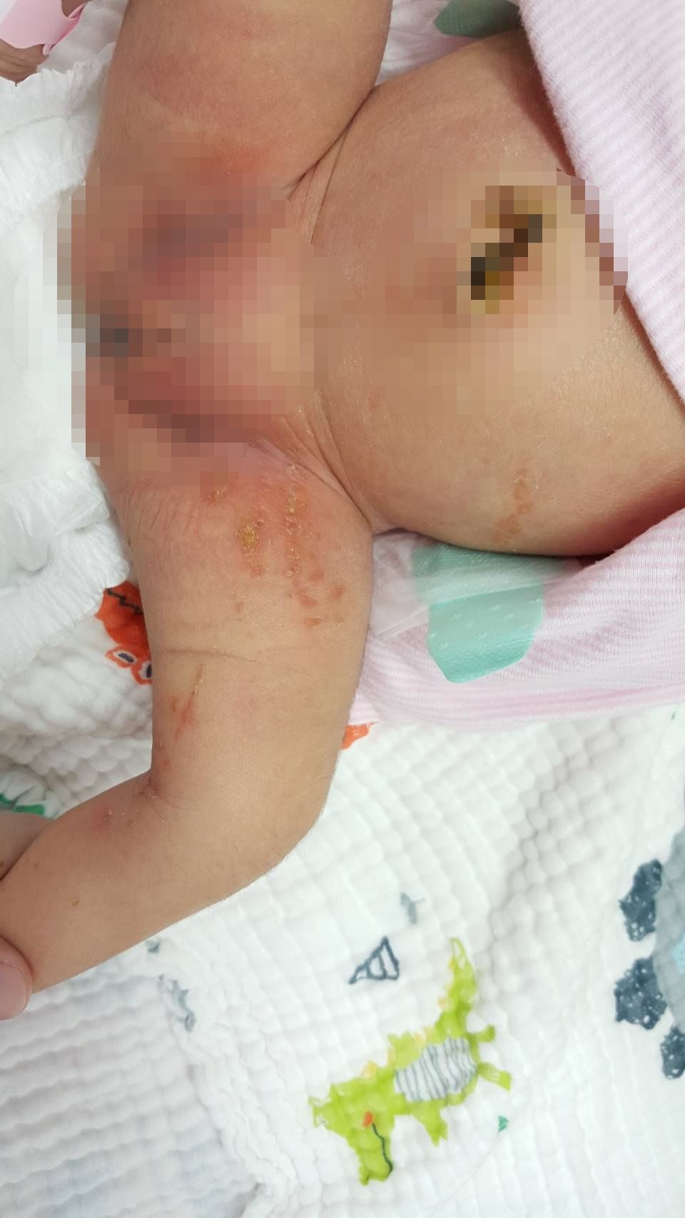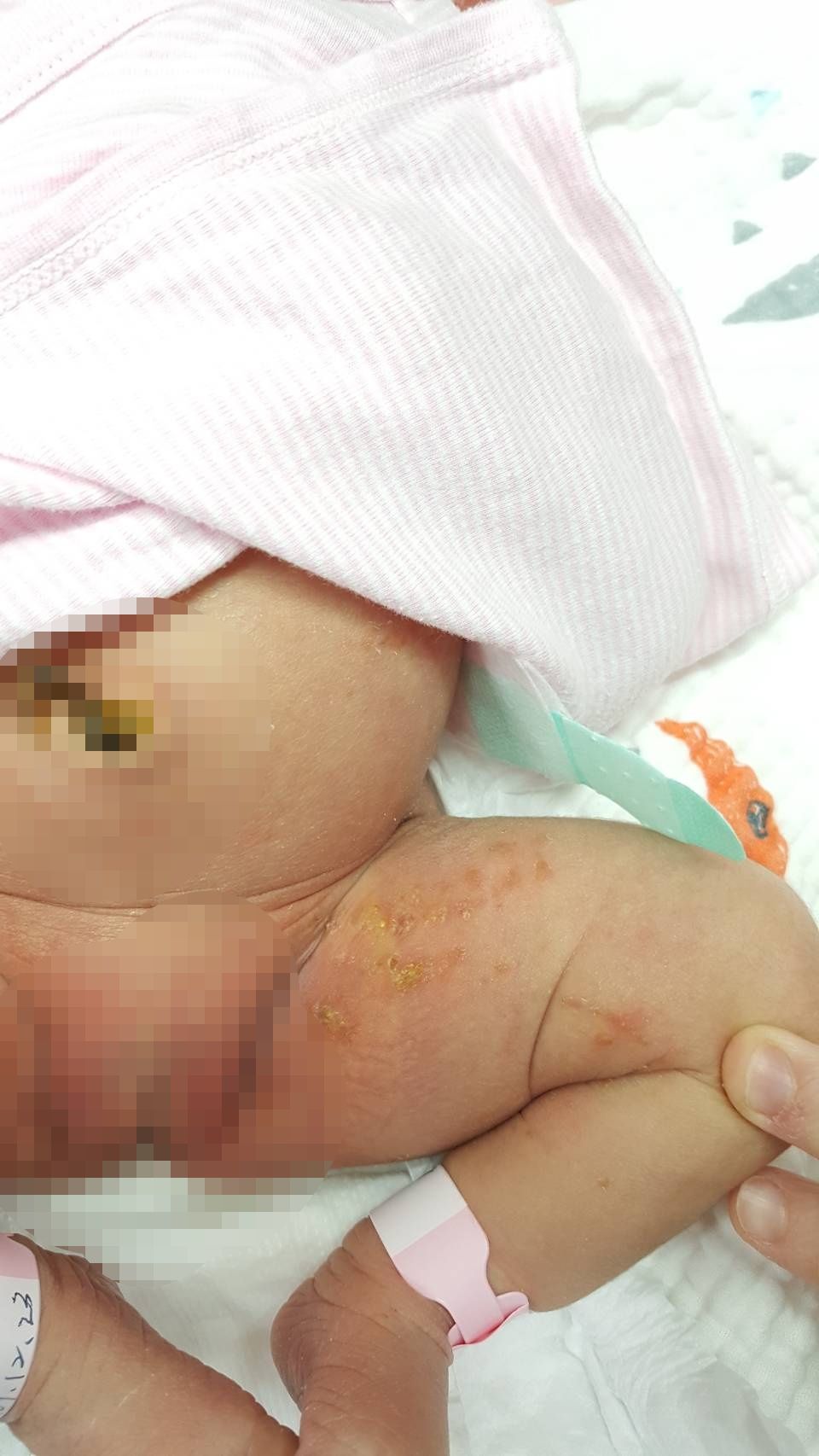 ‘’新生兒毒性紅斑’’聽起來很可怕,但是其實是很良性的東西,通常在出生後兩三天最常見,有時可以持續到兩三個星期,在臉上、身體或四肢會出先大小不一的紅斑,紅斑中有黃白色丘疹,偶有膿皰產生,手掌及腳掌都不會有病灶,發生的原因不清楚,但是會自行消失,不需任何治療。
