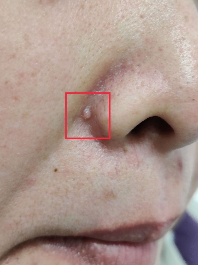 病患一進診間就問醫師,這個鼻子旁邊都青春痘可不可以幫她打痘痘針或是擠掉,她已經不想再擦藥,因為好幾個月都不會消失,醫師被問得突然,仔細看了一下,並且戴了手套摸了一下表皮觸感以及質地,給了一個鼻部纖維丘疹的診斷。