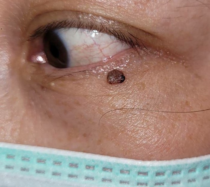 有位太太一進診間就跟醫師抱怨,眼皮下這個病毒疣,做了冷凍治療好幾次,都沒甚麼明顯的效果,改來何文藻皮膚科看看會不會改善比較快。乍看之下,的確很像病毒疣,但是醫師為求慎重,使用放大鏡在看清楚,確認其病灶並非病毒疣,而是脂漏性角化(俗名:老人斑)。