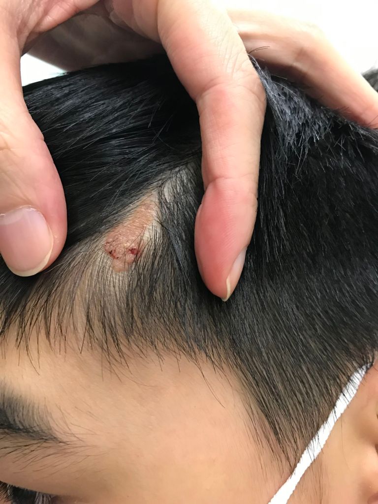 前幾日,有位媽媽帶著剛上國中的兒子到診所來,希望能夠處理頭皮上的這塊皮膚,看看是否可以使用冷凍治療或是用擦藥的方式將它去除,醫師看了頭皮上這個病灶,告訴媽媽這個叫做"皮脂腺母斑"。