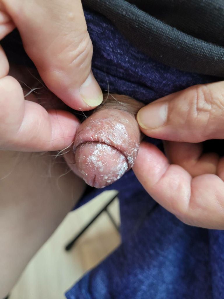某日來了一位已婚的中年男性,面有難色地問醫師能不能看私密部位,皮膚科醫師當然甚麼皮膚都看,於是請女性護理師先迴避,避免尷尬,然後請患者褪去褲子端詳仔細,患者邊脫褲子邊解釋:[也沒有跟其他的女性有甚麼不正常的關係,怎麼還會這樣子,又癢,感覺又髒髒的。]醫師看了患者的包皮跟龜頭,稍微安慰一下患者:[這個是念珠球菌感染造成的,不一定是有甚麼不正常的關係啦。]